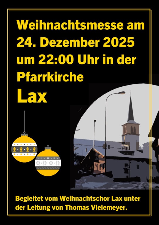 Am Mittwoch, 24. Dezember 2025, findet um 22:00 Uhr die Mitternachtsmesse in der Kirche Lax statt.